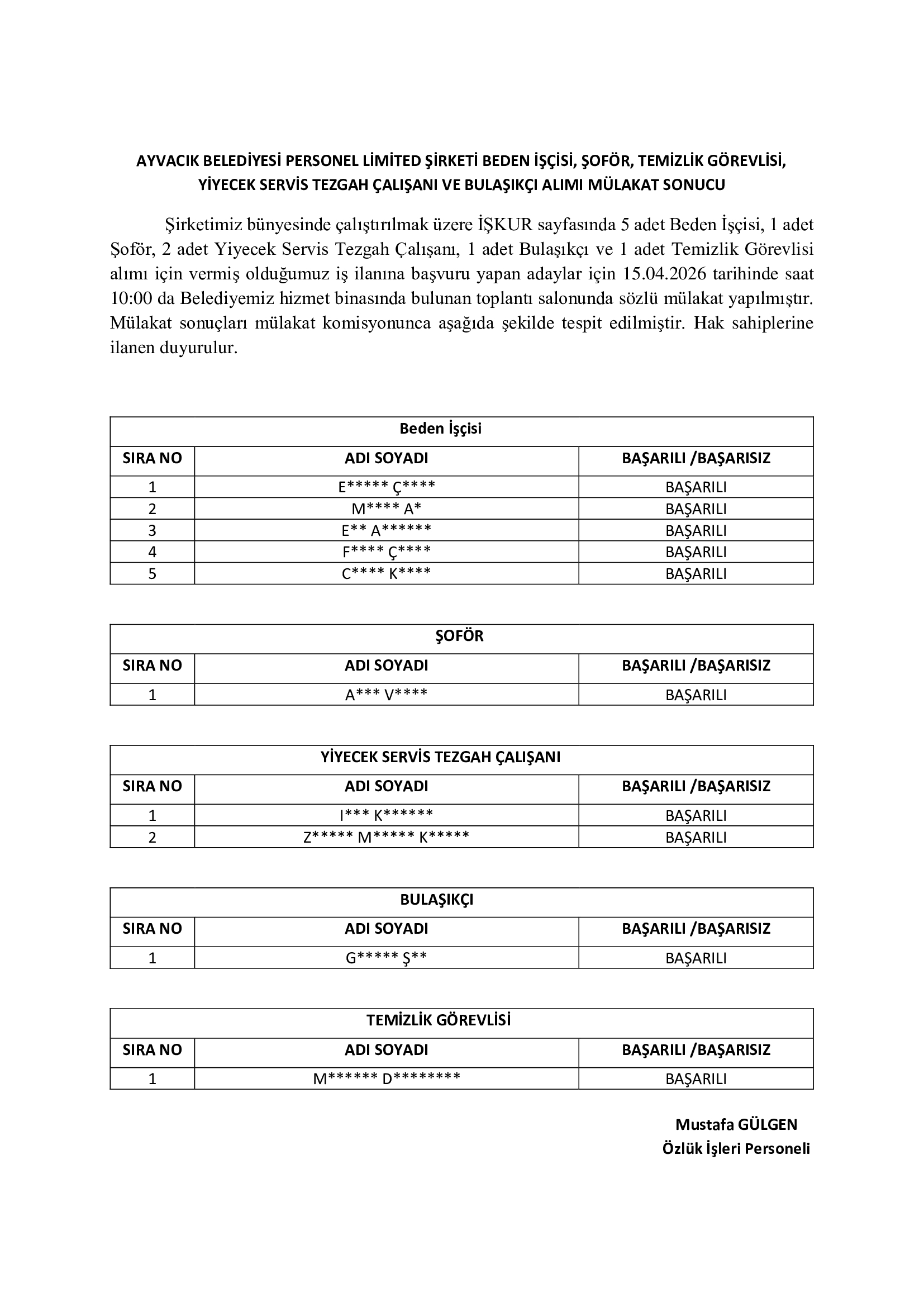 Beden İşçisi Alımı Mülakatı Sonucu